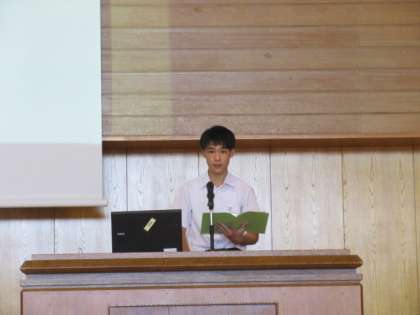 各学年の代表者が意見発表しました。体育大会のリーダーとして努力したこと、「社会に学ぶ『14歳の挑戦』」で学んだこと、仲間がいたからこそ乗り越えられたこと等を発表しました。