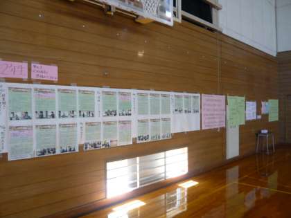 〈写真上〉3年間の集大成です。体育館一面の掲示物