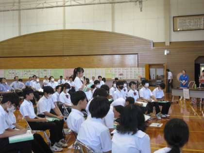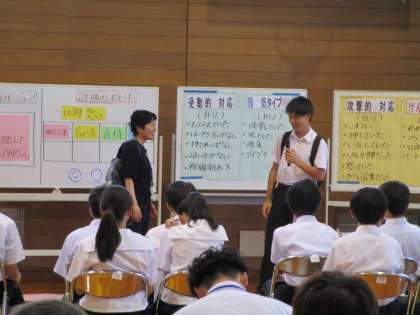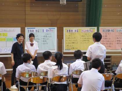 「自己主張的に悪い誘いを断る」という課題に、生徒は授業を振り返って、「ただ単に自己主張するのではなく、相手のことを思いやることが大切。」と、感想を述べました。