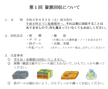 8月5日(土)は資源回収です。午前8時までに集積所へお出しください。ご協力をお願いいたします。