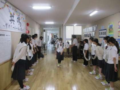 校舎内の1階生徒玄関付近で立候補者と推薦人が並び、登校する生徒へ声を掛けていました。