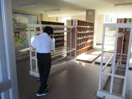 今朝も生徒玄関の砂埃を掃く3年男子生徒の姿がありました。