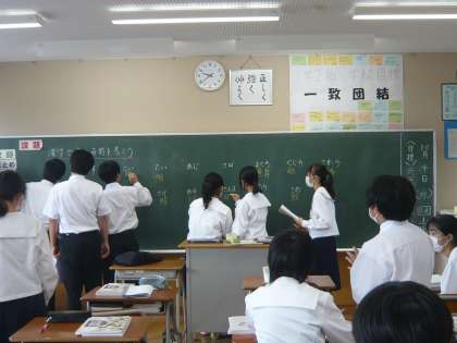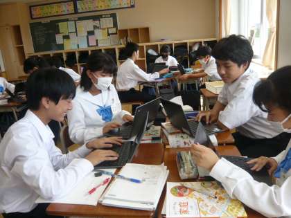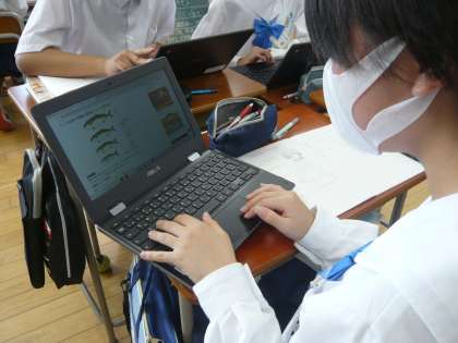 1年技術・家庭科は魚についての学習です。積極的に発表したり、クロームブックを使ってグループで調べ学習をしたりしています。
