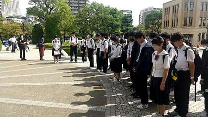 原爆の子の像前にて。黙祷。みんなで折った鶴を奉納しました。