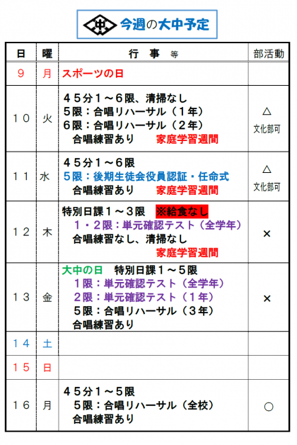 今週は、家庭学習週間になります。また、10月12日(木)・13日(金)に単元確認テストがあります。家庭での学習時間をしっかり確保し、計画的に各教科の復習をしましょう。