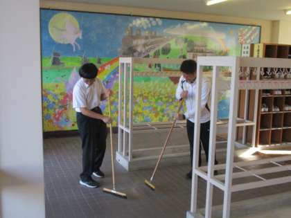 前日体育のソフトボールの授業で生徒玄関がグラウンドの砂埃で汚れている時、3年男子生徒が登校後砂埃を自主的に掃いてくれています。