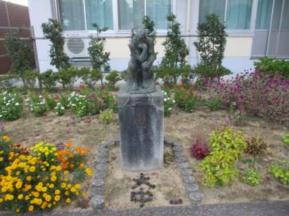 さて、本日も挨拶ボランティアの3年生が、生徒玄関前の銅像前で「大中」の文字を松ぼっくりで作っていました。