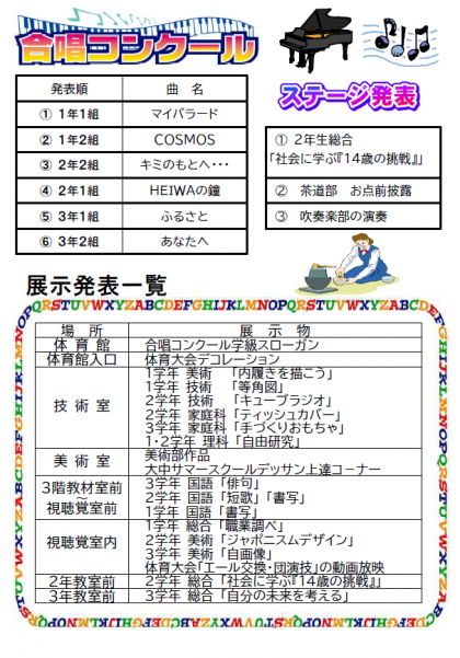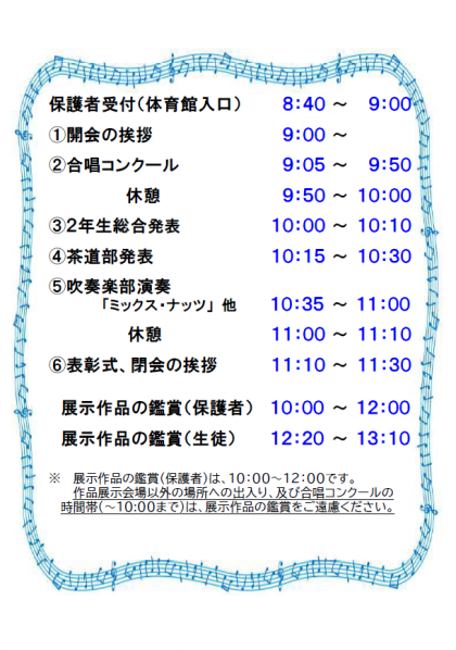 文化活動発表会のプログラムです。昨日、生徒を通じて配付いたしましたので、ご確認ください。