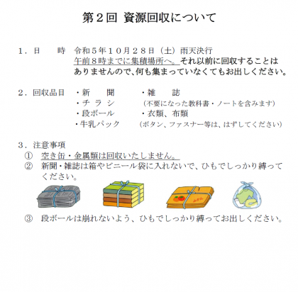 10月28日(土)は第2回資源回収です。午前8時までに集積所へお出しください。ご協力をお願いいたします。