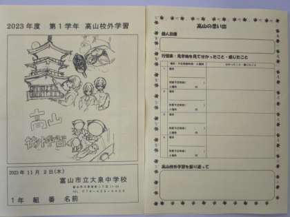 11月2日(木)にある高山校外学習のしおり読みを行いました。学年生徒会で考えたスローガンや目標、ルール、班で決めた行程表等について確認しました。また、各自で個人目標を立てるなど校外学習の成功に向けて気持ちを高めました。ご家庭でもしおりに目を通していただくようお願いします。