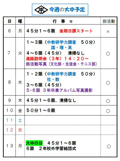 今週は、7日(火)に3年進路説明会があります。保護者受付は、14:00からです。