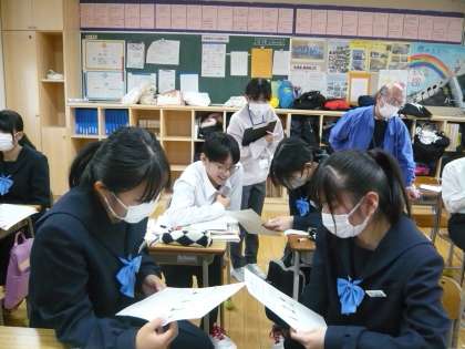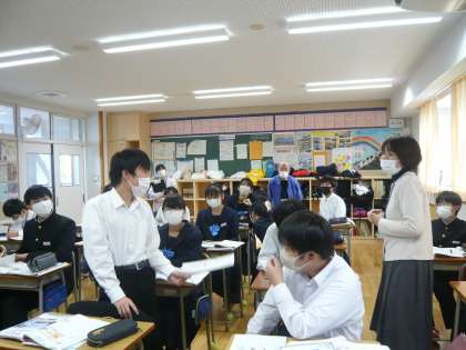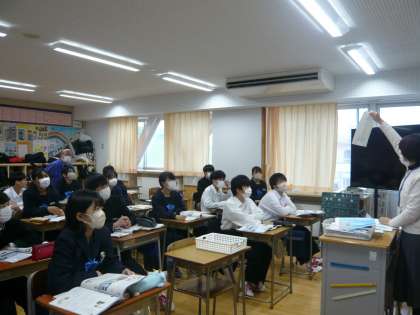 校内研修の一環として、先生方が互いの授業を参観し研修を深めました。生徒は、ペア学習を通して比較級を学んでいました。ユニークな例文の発表もあり、教室に笑顔が溢れました。