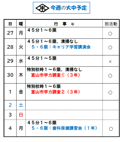 今週は、28日(火)にメンタルトレーニング指導で有名な飯山晄朗氏を講師に迎え、キャリア学習講演会を行います。また、30日(木)と1日(金)に、3年生は富山市学力調査があります。期末考査の見直し等の復習をしましょう。