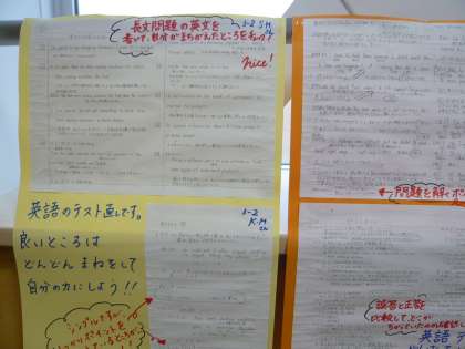 〈写真下〉3学年の廊下には、テスト直し(英語科)のお手本例が紹介されています。3年生は市学力調査等、テストが続きます。がんばろう!!positive!!