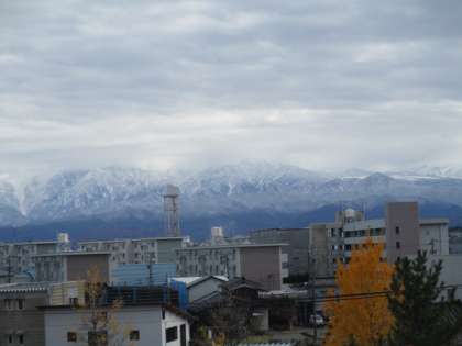 下:北館4階廊下東側の窓から見た立山連峰の景色