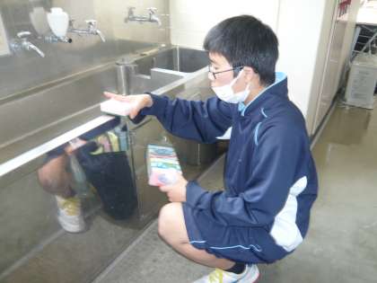 写真下:スポンジを交換する保健体育委員