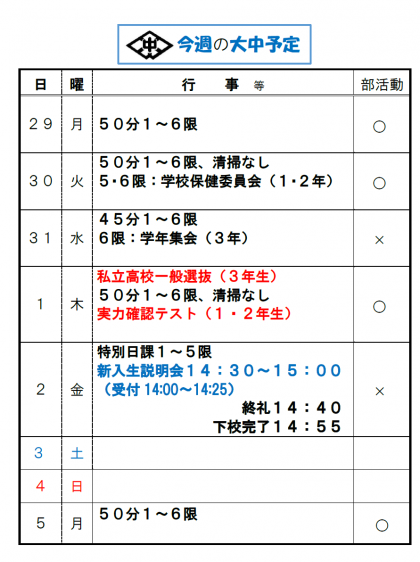 2月1日(木)は私立高校一般選抜の日です。3年生の皆さん、これまでの努力の成果を十分に発揮しましょう。なおこの日は、1・2年生は確認テストを行います。それぞれ2年後・1年後を想定して、大中生全員が顔晴る一日にしましょう。