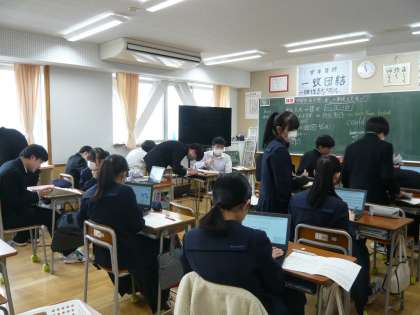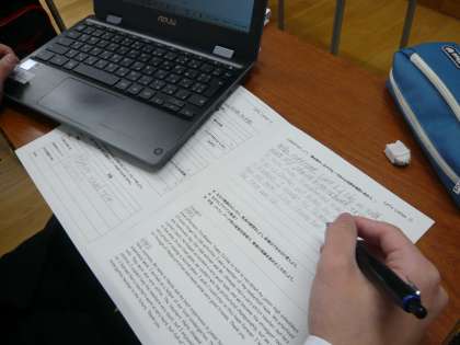 英作文「中学校生活を振り返って」のレポート作成です。学習端末を活用したり、友達の意見を参考にしたりしています。