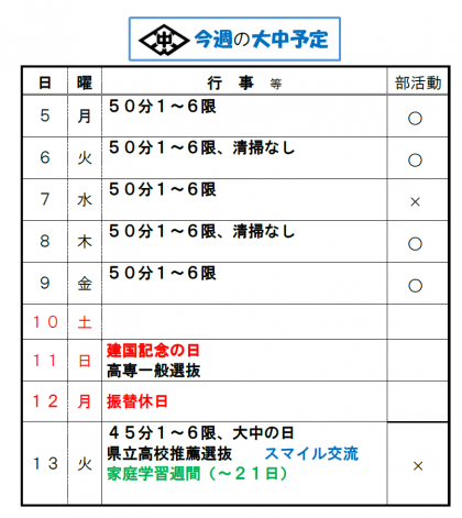 今週は、大きな行事や時間変更等はありません。 普段の生活リズムを当たり前に行う「凡事徹底」の1週間です。 20日からの学年末考査に向けて家庭学習の時間をつくっていきましょう。
