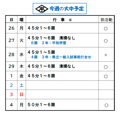 学年末考査が終わり、3年生は県立高校の一般入試が近づいてきました。体調管理に気を付けながら、入試までの日々を有意義に過ごしましょう。また、1・2年生は部活動等、新たな目標に向かって、充実した生活を送りましょう。