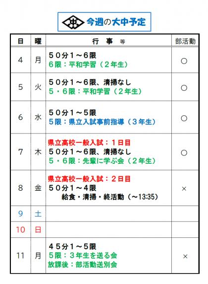 今週は、7日(木)・8日(金)は、県立高校の一般選抜です。受検生の皆さんは、体調管理に気を付けて、万全の状態で臨みましょう。