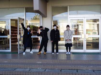 執行部が挨拶運動ををしています。登校してくる生徒からも元気な挨拶の声が聞こえます。