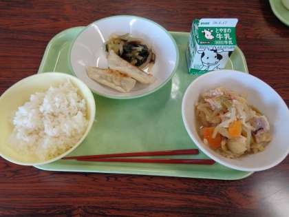 今日の給食はごはん、牛乳、焼きぎょうざ、海藻サラダ、肉豆腐です。