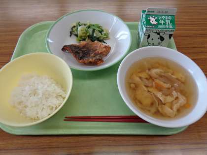 今日のメニューは、ごはん、牛乳、魚の竜田揚げ、おひたし、沢煮椀です。