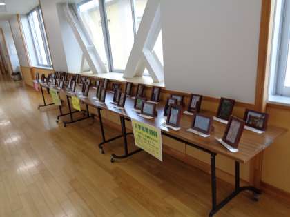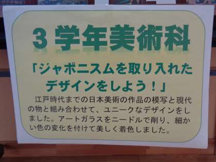 1階技術室前に3年生が作った美術作品が展示してあります。明日の授業参観等で来校の折にぜひご覧ください。
