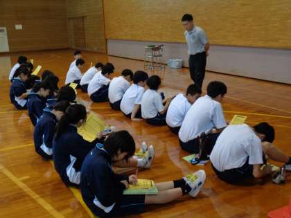 2組は体育です。記録を記入しています。記録更新できたかな?