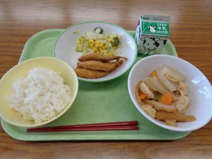 今日のメニューは、ごはん、牛乳、わかさぎのフリッター、コールスローサラダ、関東だきでした。