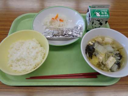 今日のメニューは、ごはん、牛乳、さばの銀紙焼き、なます、すまし汁でした。美味しくいただきました。