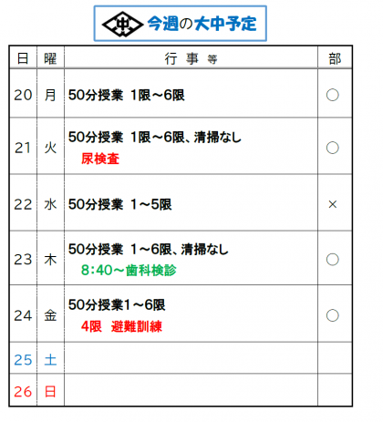 今週は21日(火)に尿検査があります。 朝に忘れずに採尿し、登校したら教室の容器立てに提出しましょう。