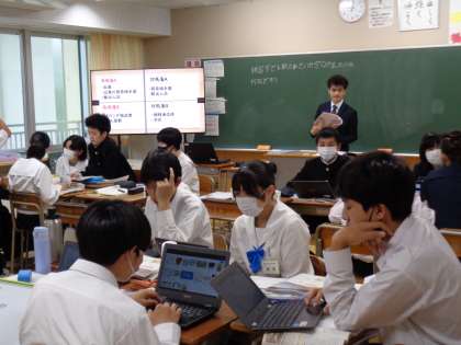 社会は、実習生の先生でした。グループで話し合いをしています。