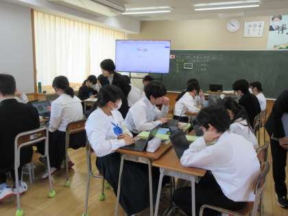 2年1組の家庭科の授業です。グループになり、クロームブックのジャムボードを利用して、火を通した料理、火を通していない料理をグループ分けしました。