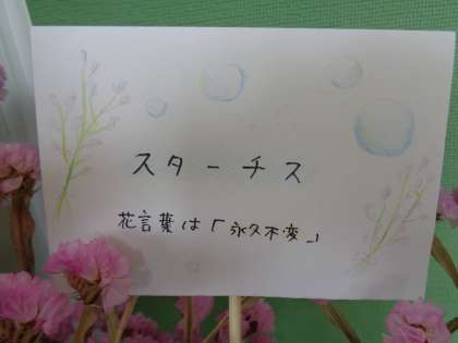 職員室前の花瓶の花にプレートを付けました。