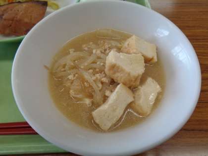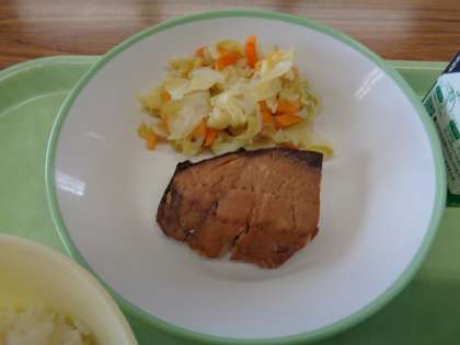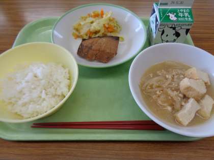メニューは、ごはん、牛乳、ふくらぎの照り焼き、野菜ソテー、厚揚げの中華煮込みでした。