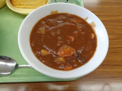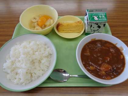 今日のメニューは、ごはん、牛乳、たべキリンハヤシ、卵ロール、フルーツミックスでした。美味しくいただきました。