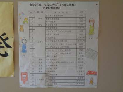 7月1日(月)から5日(金)まで、「社会に学ぶ『14歳の挑戦』」です。どこの事業所があるのか、掲示されました。イラストが素敵ですね。