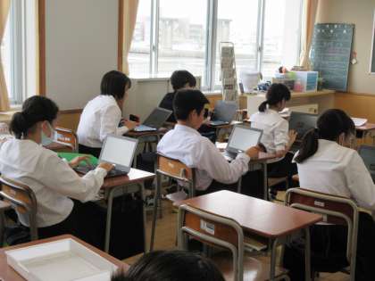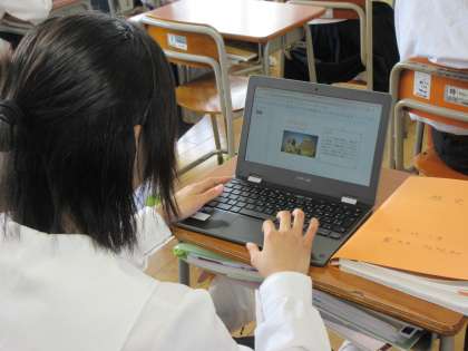 1年生の社会は、4大文明の中から興味をもったものを1つ選んで、クロームブックを使ってスライドにまとめています。