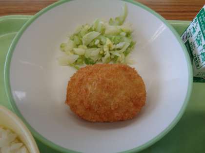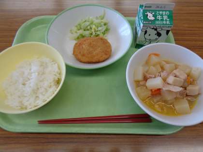 メニューは、ごはん、牛乳、コロッケ、ゆでキャベツ、大根のみそ煮込みです。美味しくいただきました。