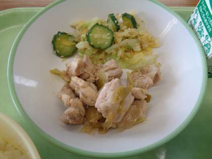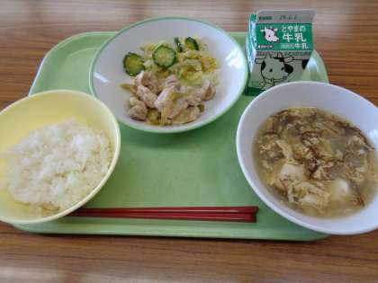 今日のメニューは、ごはん、牛乳、あっさりチキン、あわせ和え、たまごともずくのスープです。美味しくいただきました。