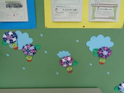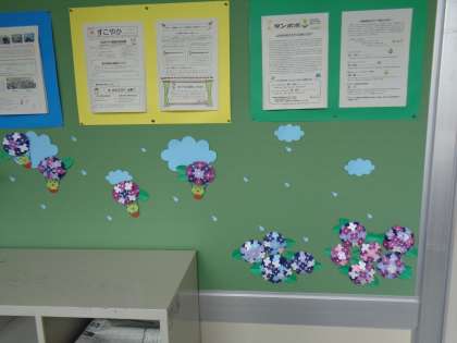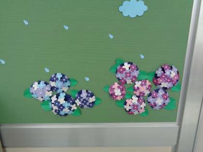 職員室前の掲示板です。折り紙でアジサイの花が掲示してあります。梅雨が近づいていますね。