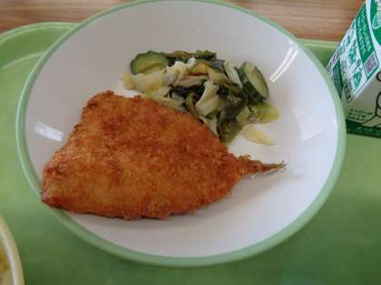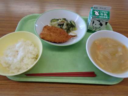 メニューは、ごはん、牛乳、あじフライ、海藻サラダ美味しくいただきました美味しくいただきました。