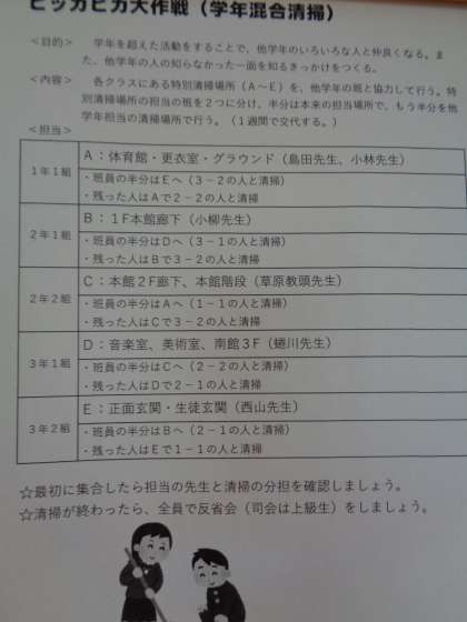学年混合で清掃を行います。校舎内をピカピカにしましょう。