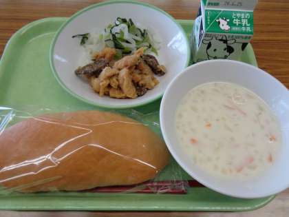 メニューは、米粉コッペパン、牛乳、鶏肉とレバーのリンゴソースからめ、大根サラダ、ビーンズポタージュでした。美味しくいただきました。