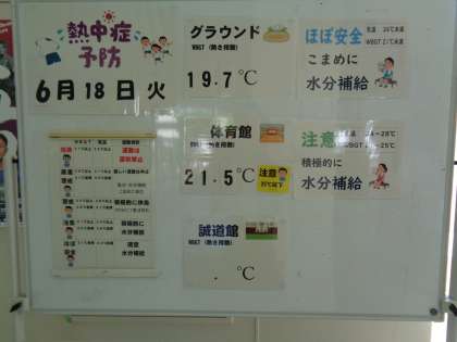 生徒玄関のホワイトボードに毎日熱中症指数等が記入されています。今日も暑そうです。水分補給、マスクを外すなど熱中症にならないように対策をしましょう。