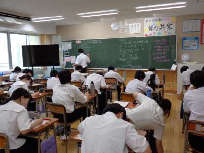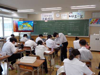 2年生です。数学と美術の授業です。数学は、解答を黒板に書いています。他の人も一生懸命考えていました。美術は美術室にエアコンがないので、教室でおこなっています。模写をしていました。