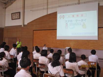 6/25(火)人権擁護の観点からスマートフォンの適切な使い方を学ぶ「スマホ・ケータイ安全教室・人権教室」を行いました。分かりやすい動画の事例から、生徒は普段のスマートフォンの使い方について考えました。夏季休業中にもSNSの使い方などでトラブルが生じるケースが多くあります。是非、ご家庭でも親子で話し合い、適切な使い方について考える機会をもっていただければ幸いです。