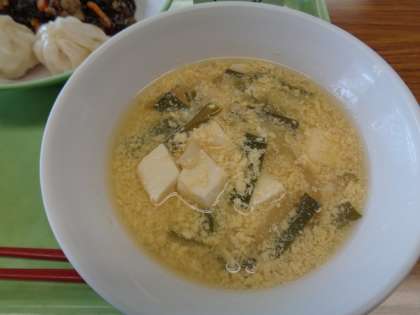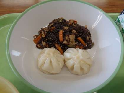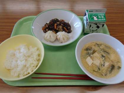 今日のメニューは、ごはん、牛乳、えび包子、もずくのチャプチェ、にら玉汁でした。残さず食べましょう。